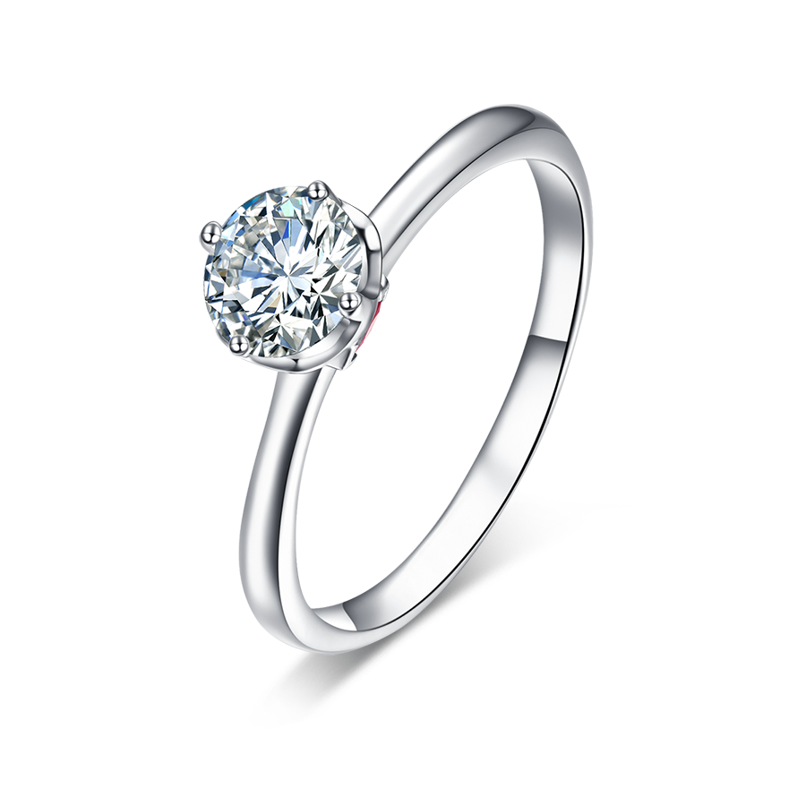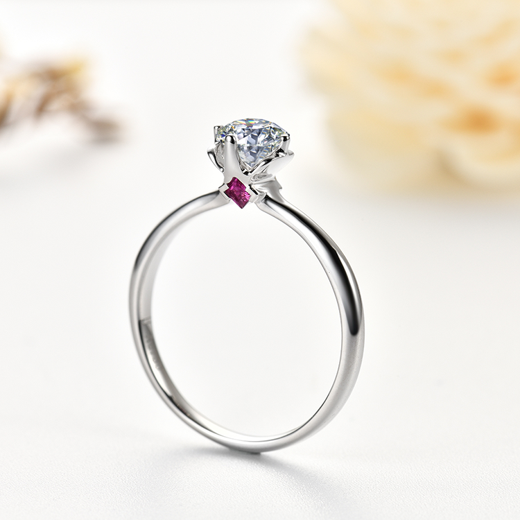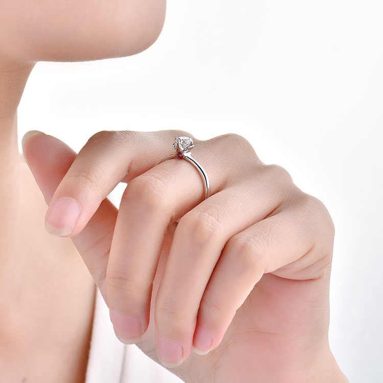 四爪镂空镶嵌设计 尽显钻石通透光感 独特侧镶点睛红宝石戒指 对爱情永恒的承诺